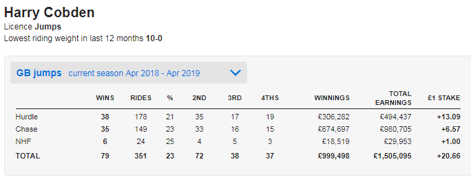 I don't need to tell you how good Harry Cobden has been this season but here is this seasons stats just to back him up...