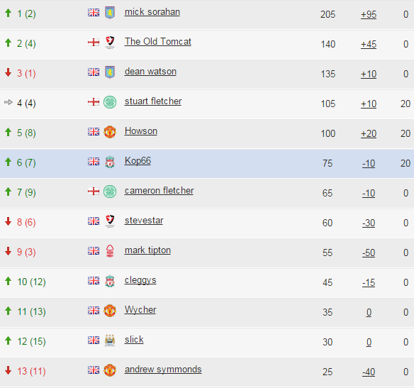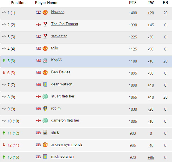 A reminder that the top 4 qualify for H2H semi finals. It's all still wide open and stuart fletcher, Howson and Kop66 in 4th, 5th and 6th are happy to be the only ones with their maximum Banker Bonus left intact.