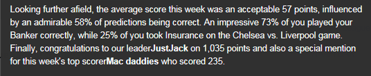 A very low average score this week that 17 of our players managed to equal or exceed. A 27% correct Bankers Bonus probably skews the average points heavily downwards.